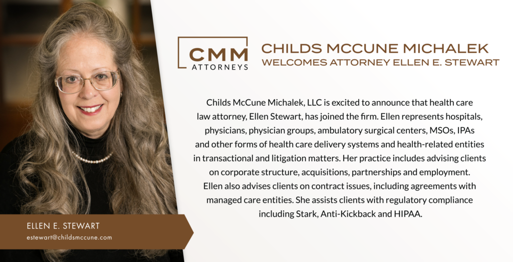 Childs McCune Michalek, LLC is excited to announce that health care law attorney, Ellen Stewart, has joined the firm. Ellen represents hospitals, physicians, physician groups, ambulatory surgical centers, MSOs, IPAs and other forms of health care delivery systems and health-related entities in transactional and litigation matters. Her practice includes advising clients on corporate structure, acquisitions, partnerships and employment. Ellen also advises clients on contract issues, including agreements with managed care entities. She assists clients with regulatory compliance including Stark, Anti-Kickback and HIPAA.